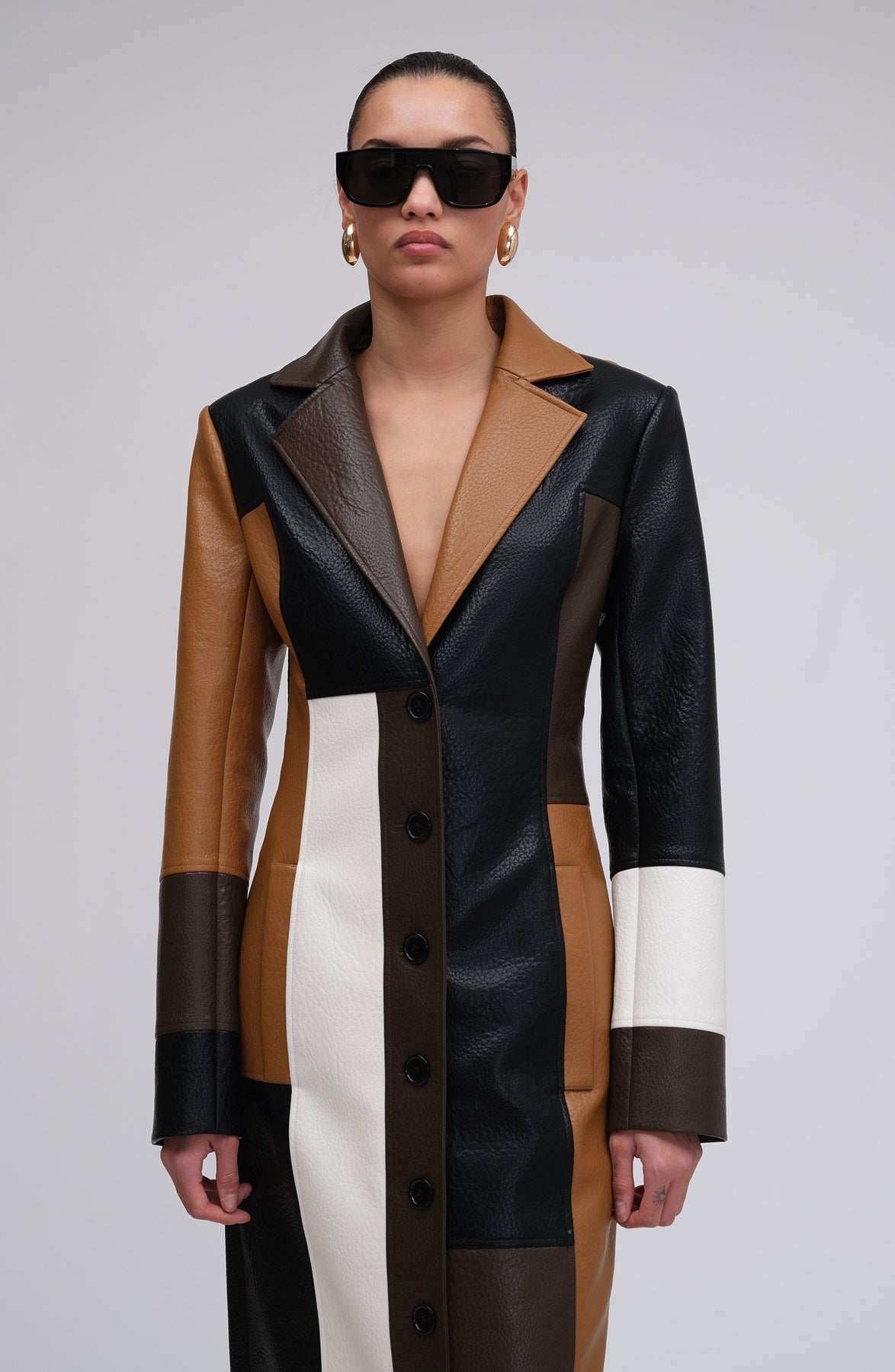 Step up your outerwear game with the Kya Vintage Leather Coat, a striking fusion of vintage edge and timeless appeal. Crafted from premium faux leather, this statement piece features bold colorblock paneling that adds just the right amount of personality. Whether layered over casual fits or dressed-up looks, this coat brings an effortlessly polished vibe to any ensemble.